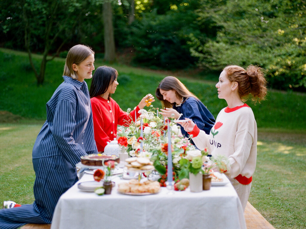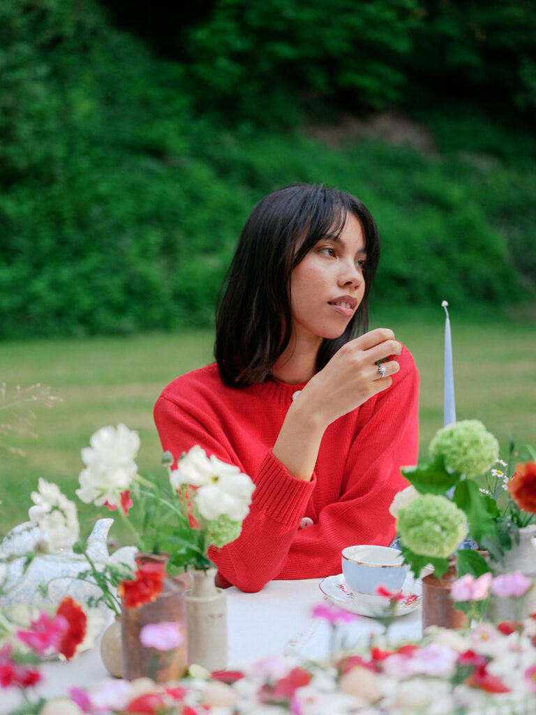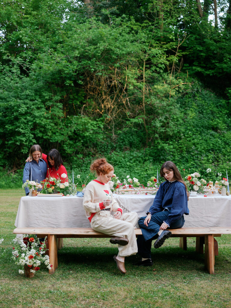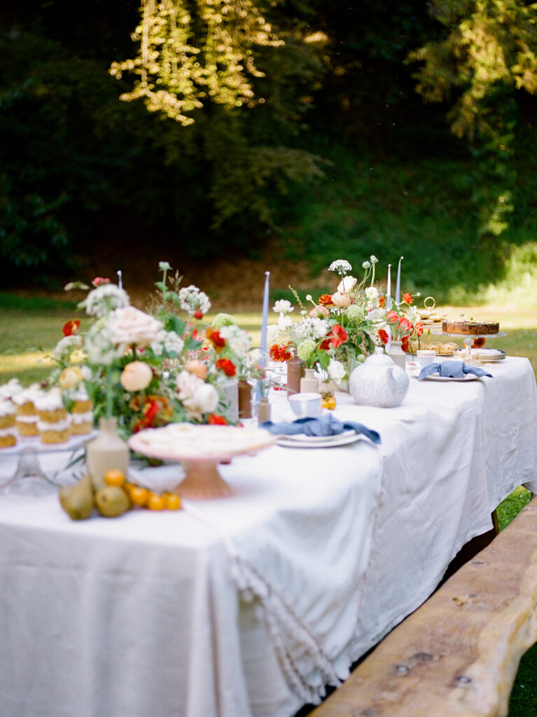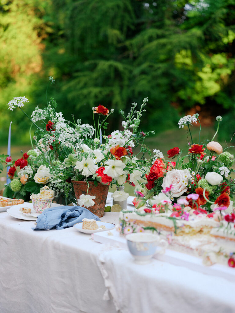 The table was layered with delicate linens, handmade ceramics, and clusters of taper candles to echo the brand’s timeless, relaxed aesthetic. As the afternoon light filtered through the trees, the florals came to life glowing softly against the white cloth, their colours deepening with the fading sun.