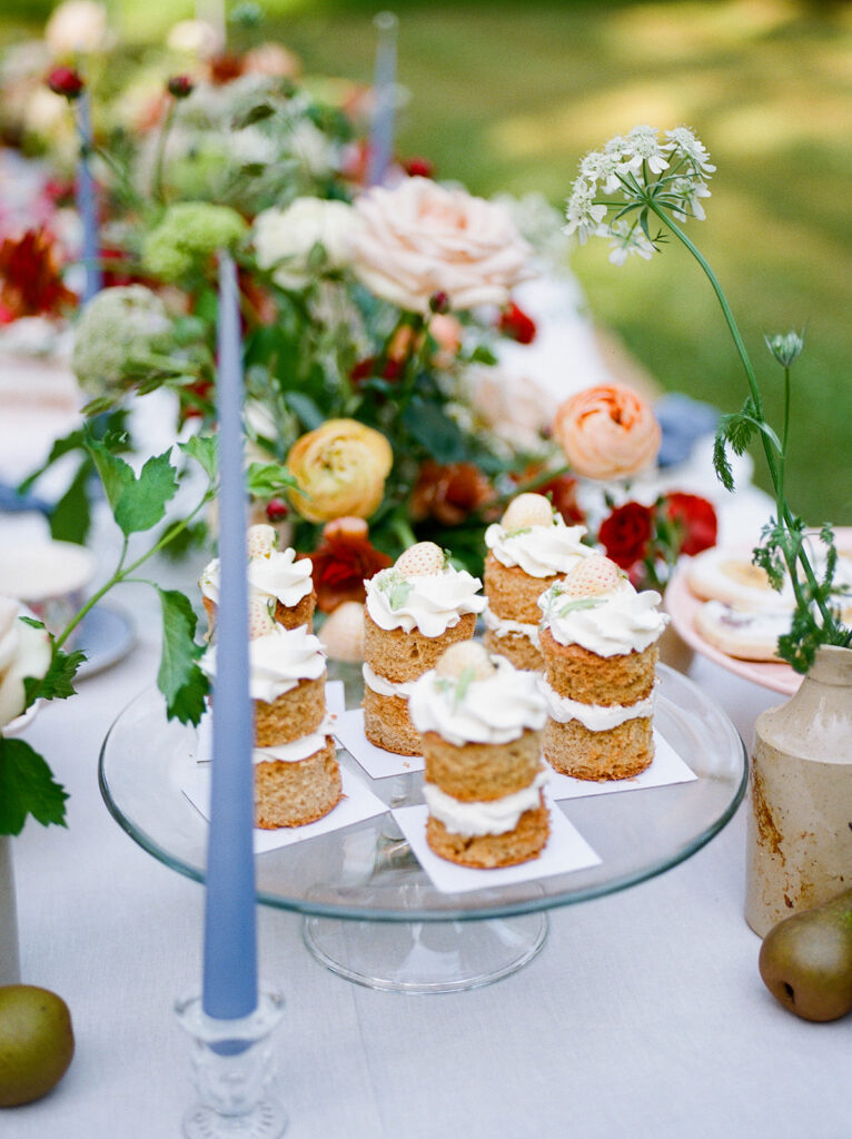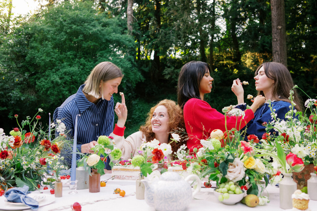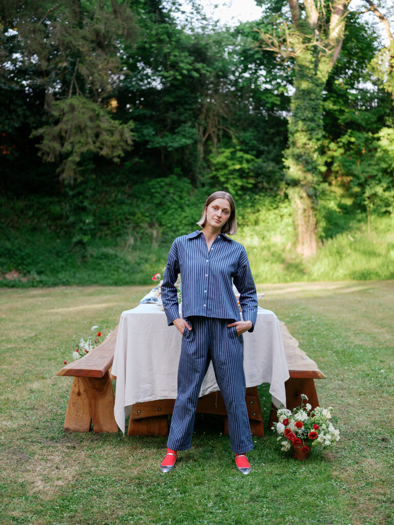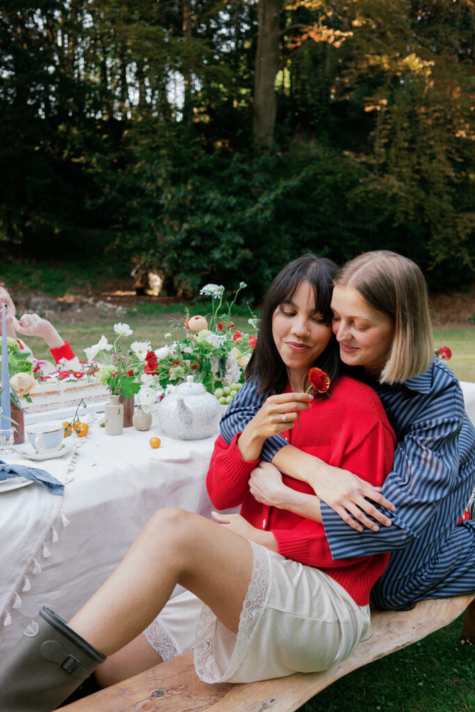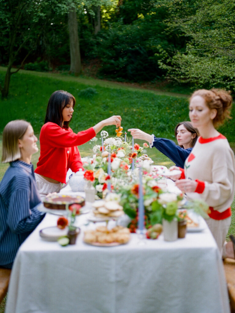 The table was layered with delicate linens, handmade ceramics, and clusters of taper candles to echo the brand’s timeless, relaxed aesthetic. As the afternoon light filtered through the trees, the florals came to life glowing softly against the white cloth, their colours deepening with the fading sun.