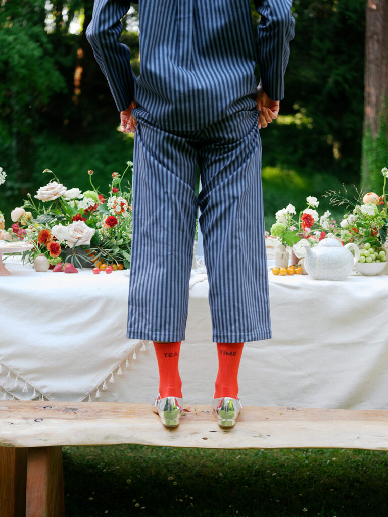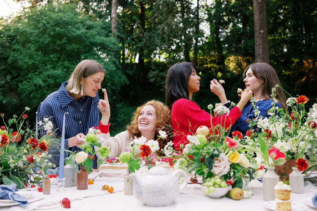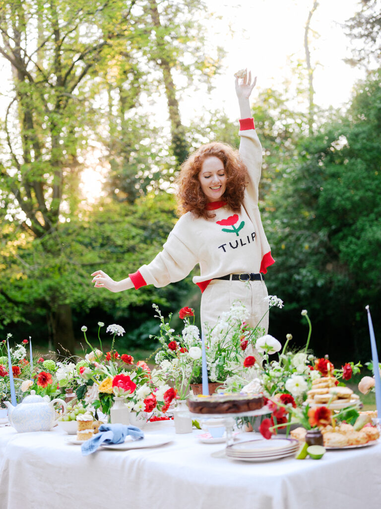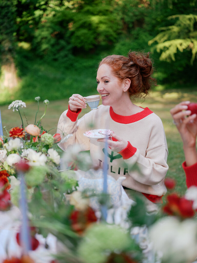 When US clothing brand Shop Tea Time approached us to create the florals for their spring marketing shoot, we instantly envisioned a scene that celebrated the poetry of the garden, a table overflowing with colour, texture, and rambling florals. Set amongst a canopy of soft greenery, this editorial shoot showcased the brand’s new collection and playfully complimented their name to create a beautiful tea party inspired setup.